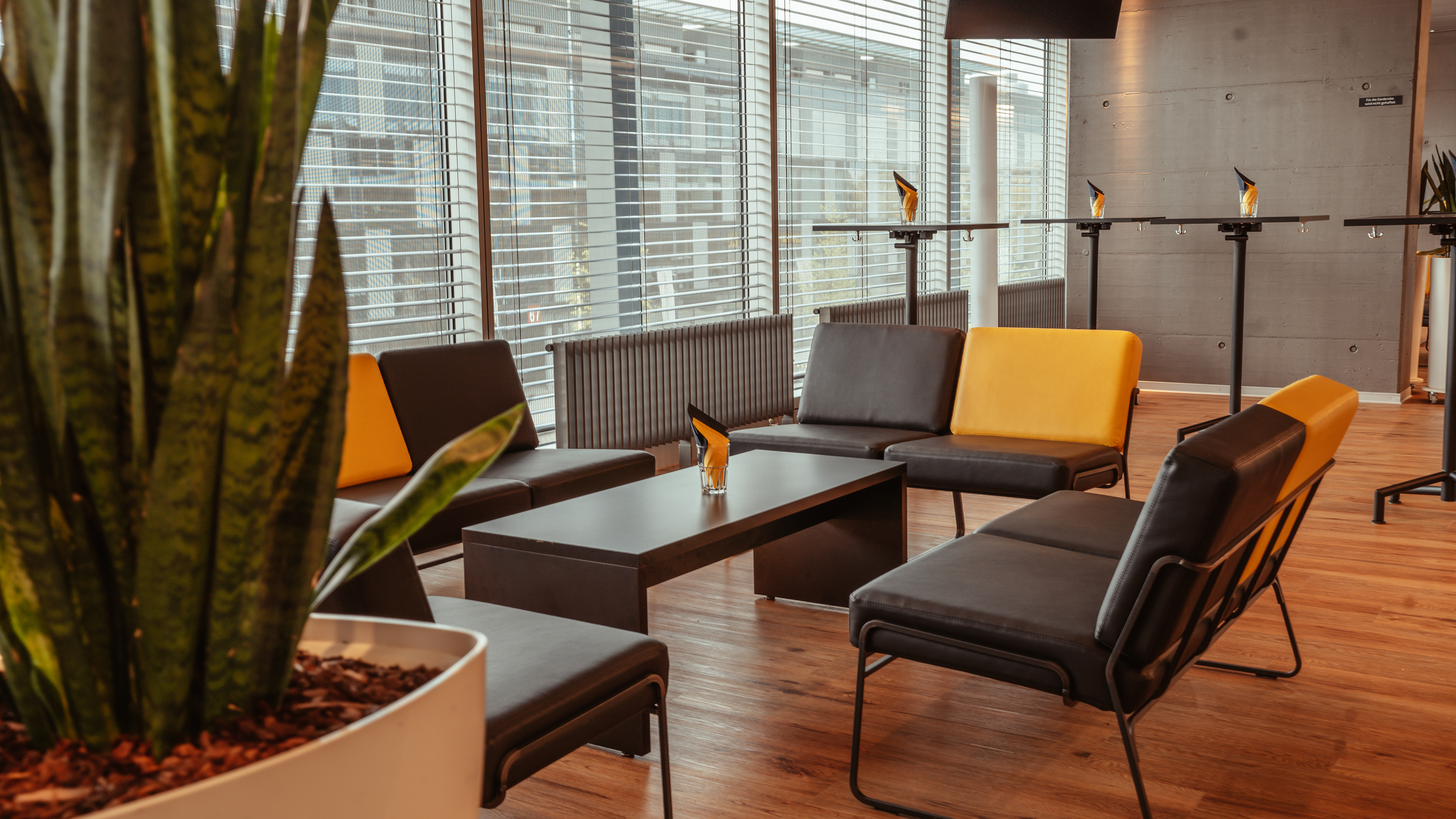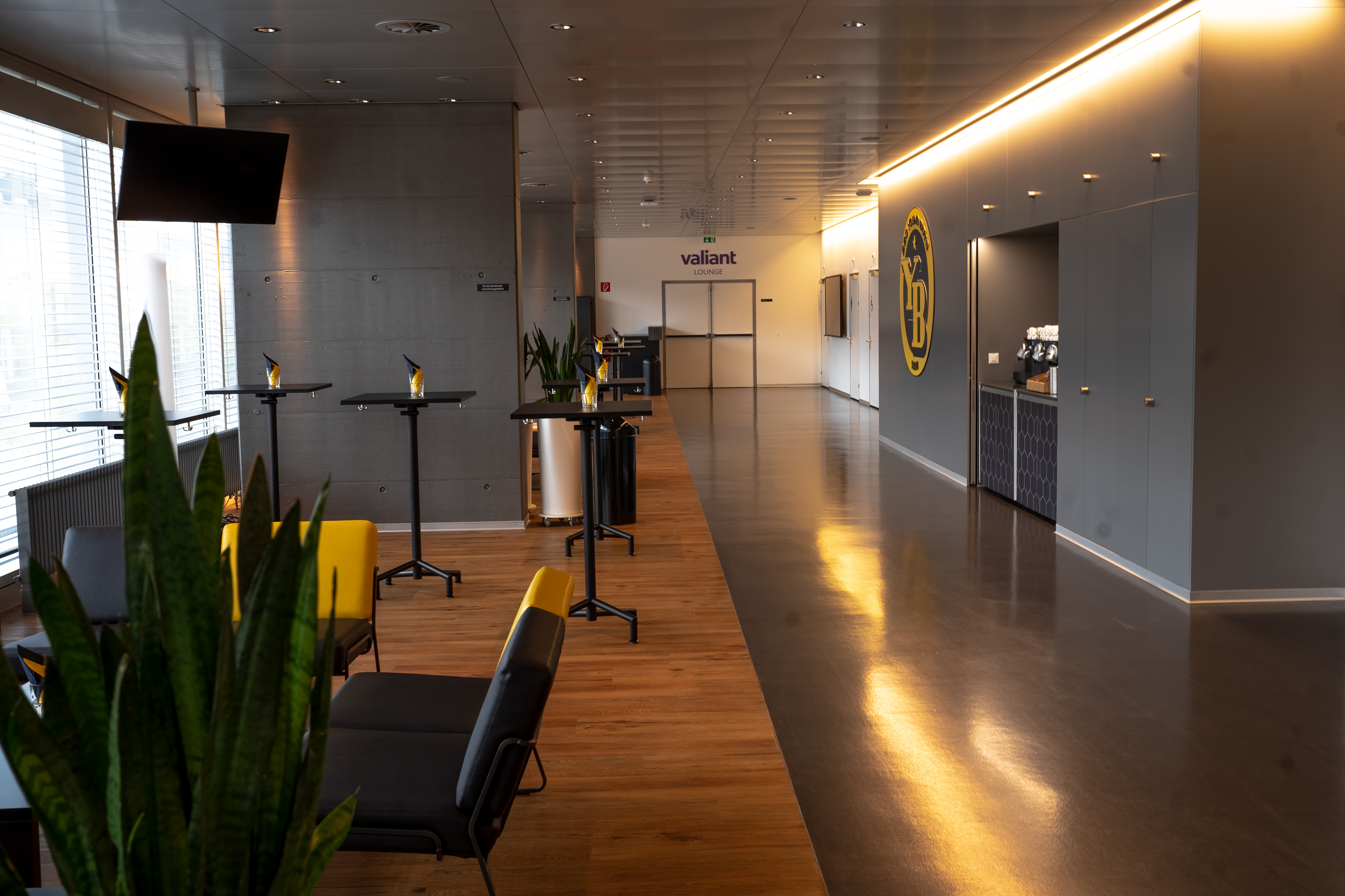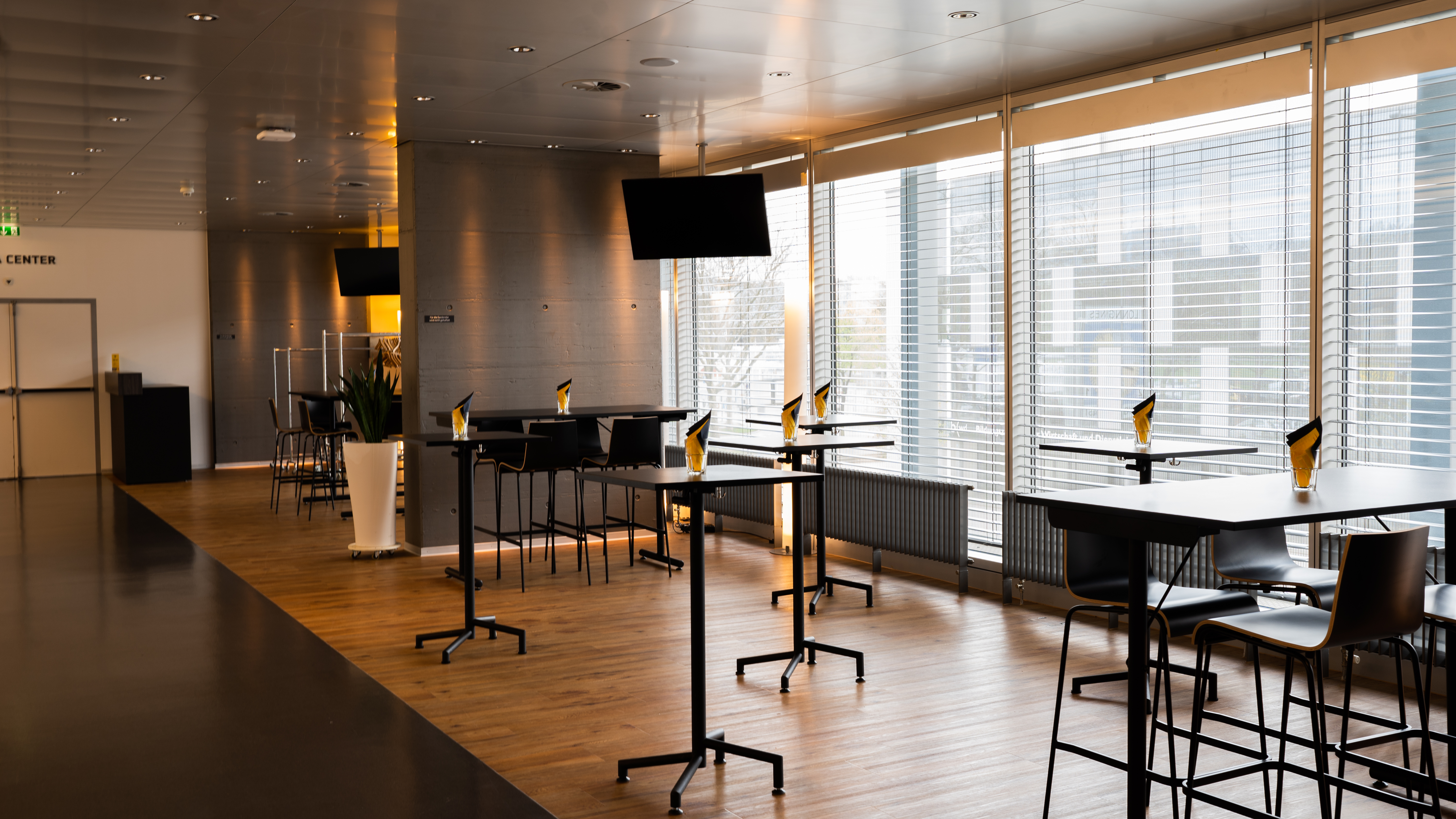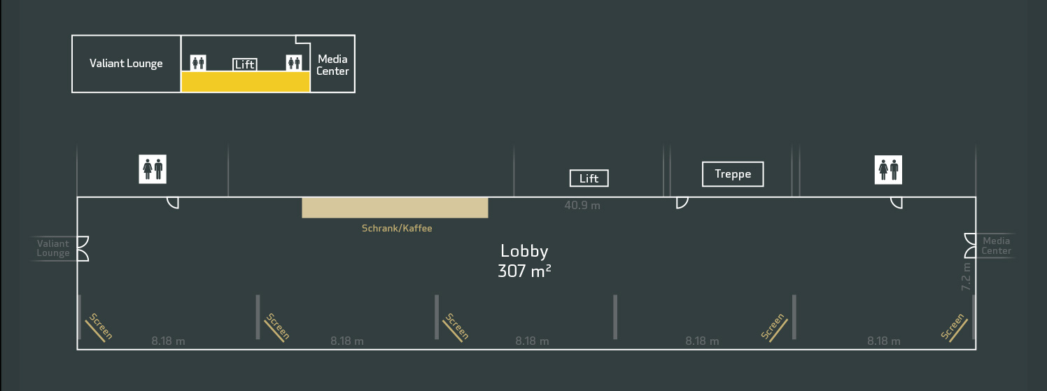 Die Lobby befindet sich auf dem zweiten Stock zwischen der Valiant Lounge und dem Media Center. Sie passt gut für Caterings aller Art an Stehtischen und eignet sich aber auch als Empfangsbereich oder Registration für Veranstaltungen.