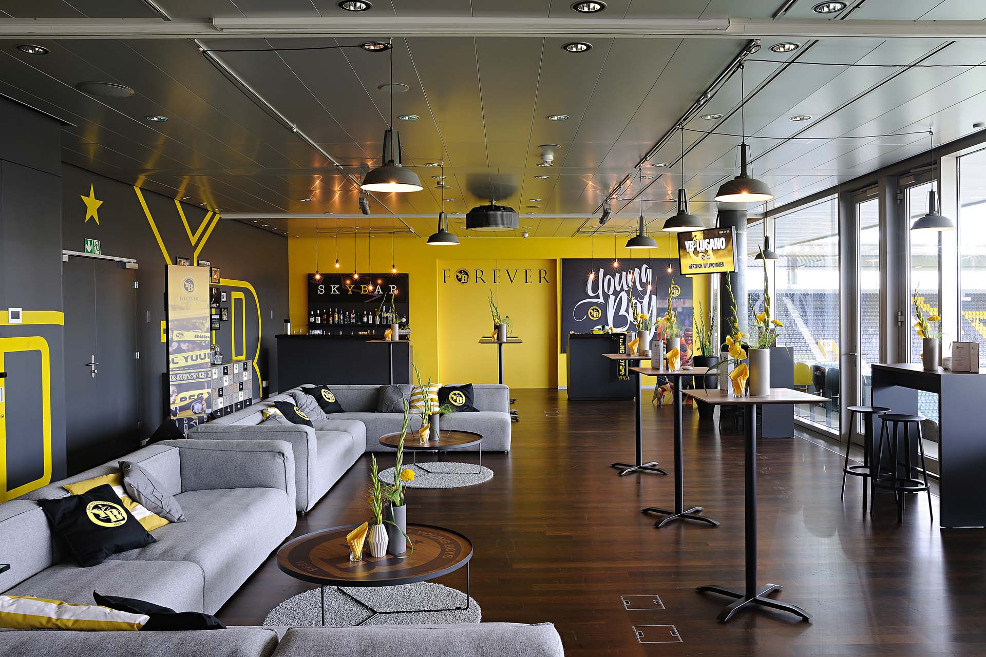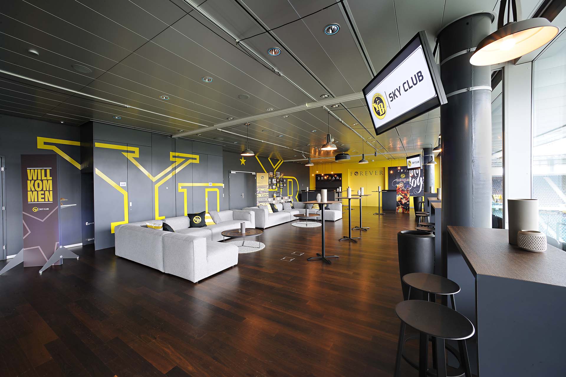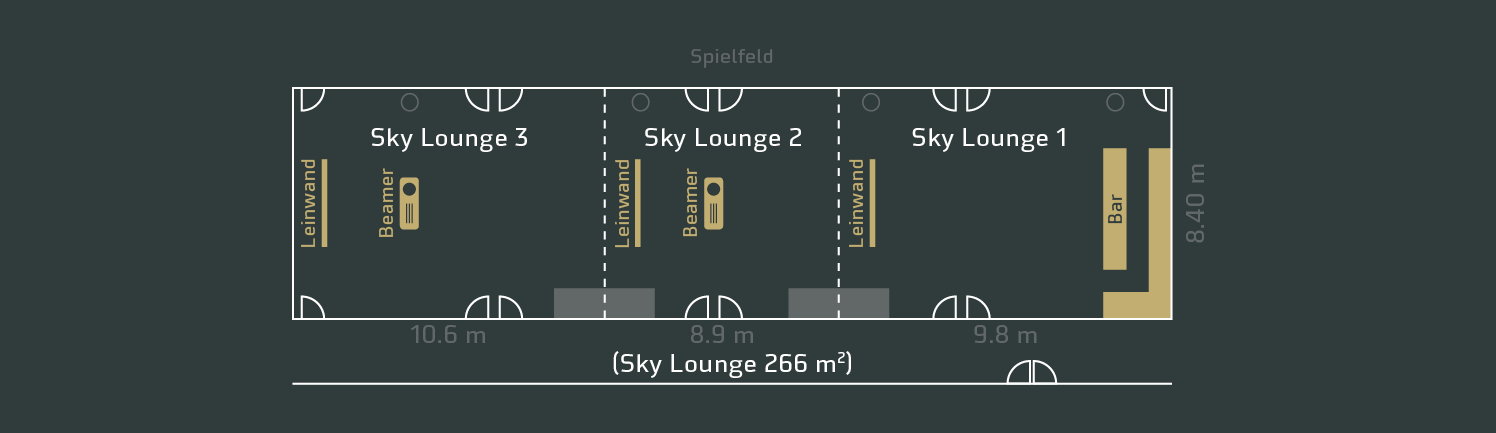 Die 266m² grosse Sky Lounge liegt im vierten Obergeschoss. Das dunkle Parkett und das hochwertige Mobiliar verleihen dem Raum eine moderne Atmosphäre. Der direkte Zugang zur Tribüne und die einseitige Fensterfront geben dem Raum eine spezielle Note.