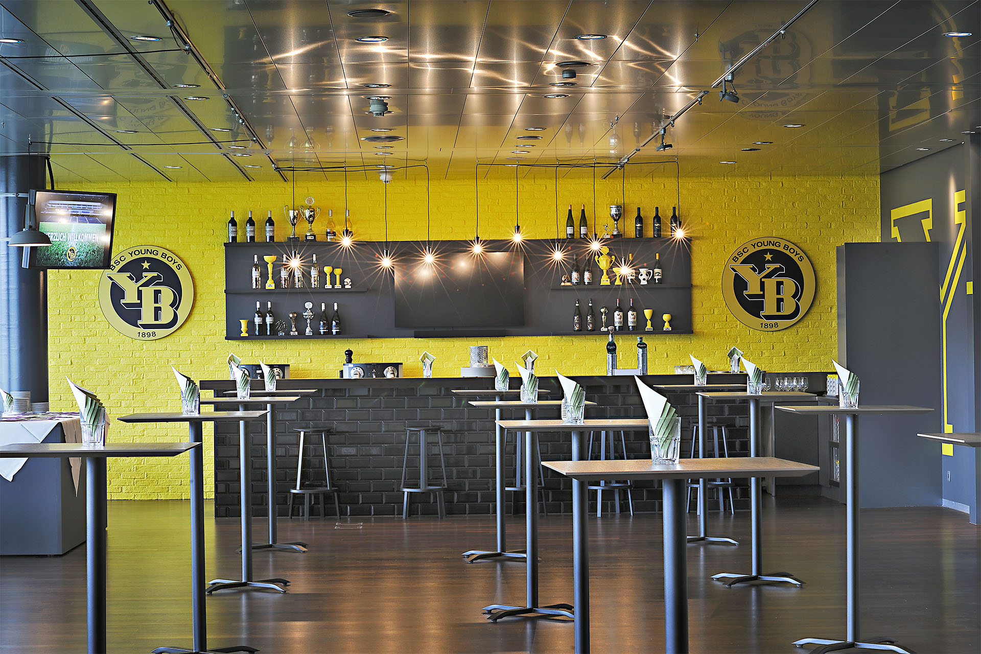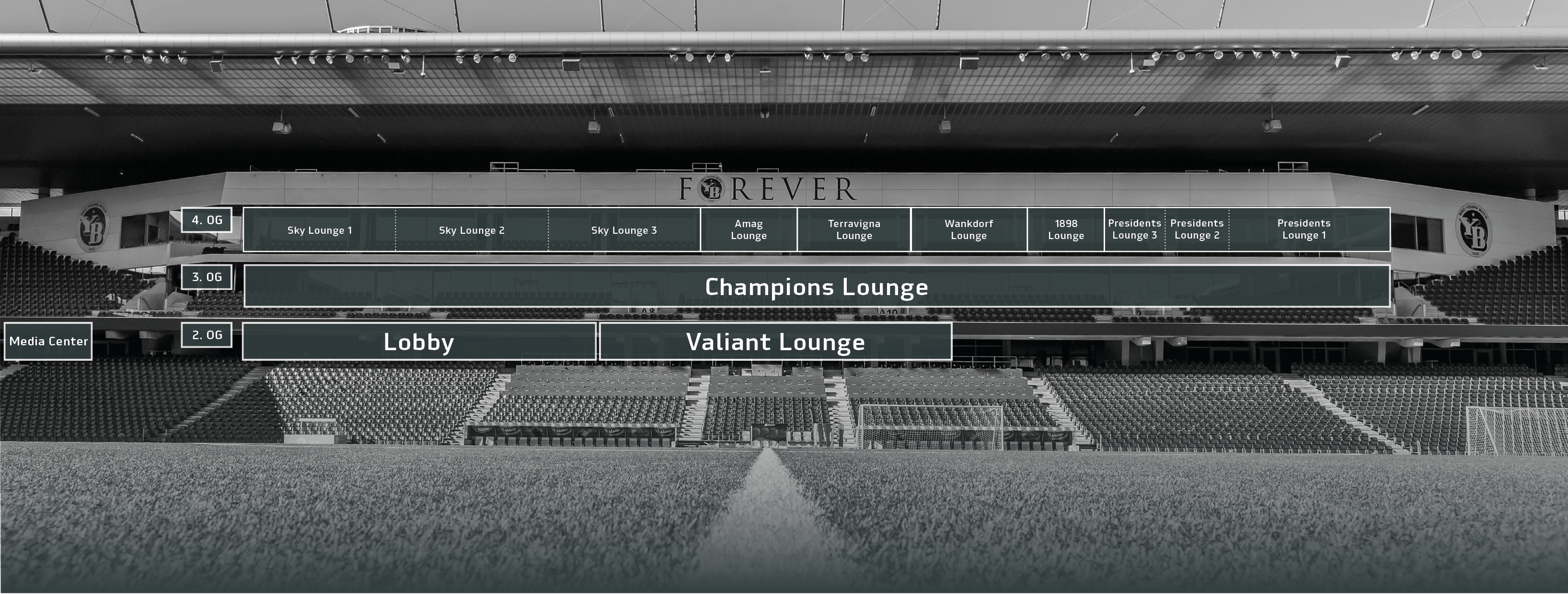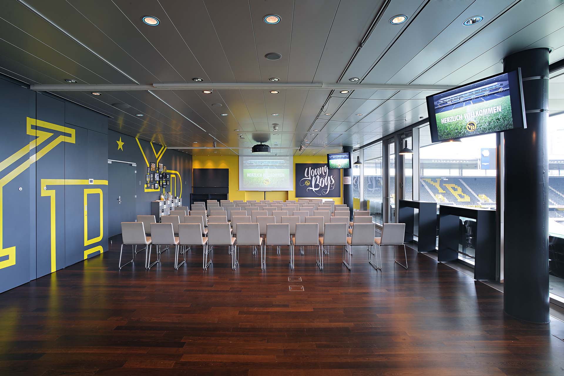 Die 266m² grosse Sky Lounge liegt im vierten Obergeschoss. Das dunkle Parkett und das hochwertige Mobiliar verleihen dem Raum eine moderne Atmosphäre. Der direkte Zugang zur Tribüne und die einseitige Fensterfront geben dem Raum eine spezielle Note.