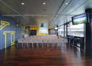 Le Sky Lounge d’une taille de 266m² est situé au quatrième étage. Le parquet de bois sombre et le mobilier haut de gamme contribuent à l’aspect moderne de cet espace. L’accès direct à la tribune du public et la baie vitrée unilatérale confèrent à ce local une touche particulière.