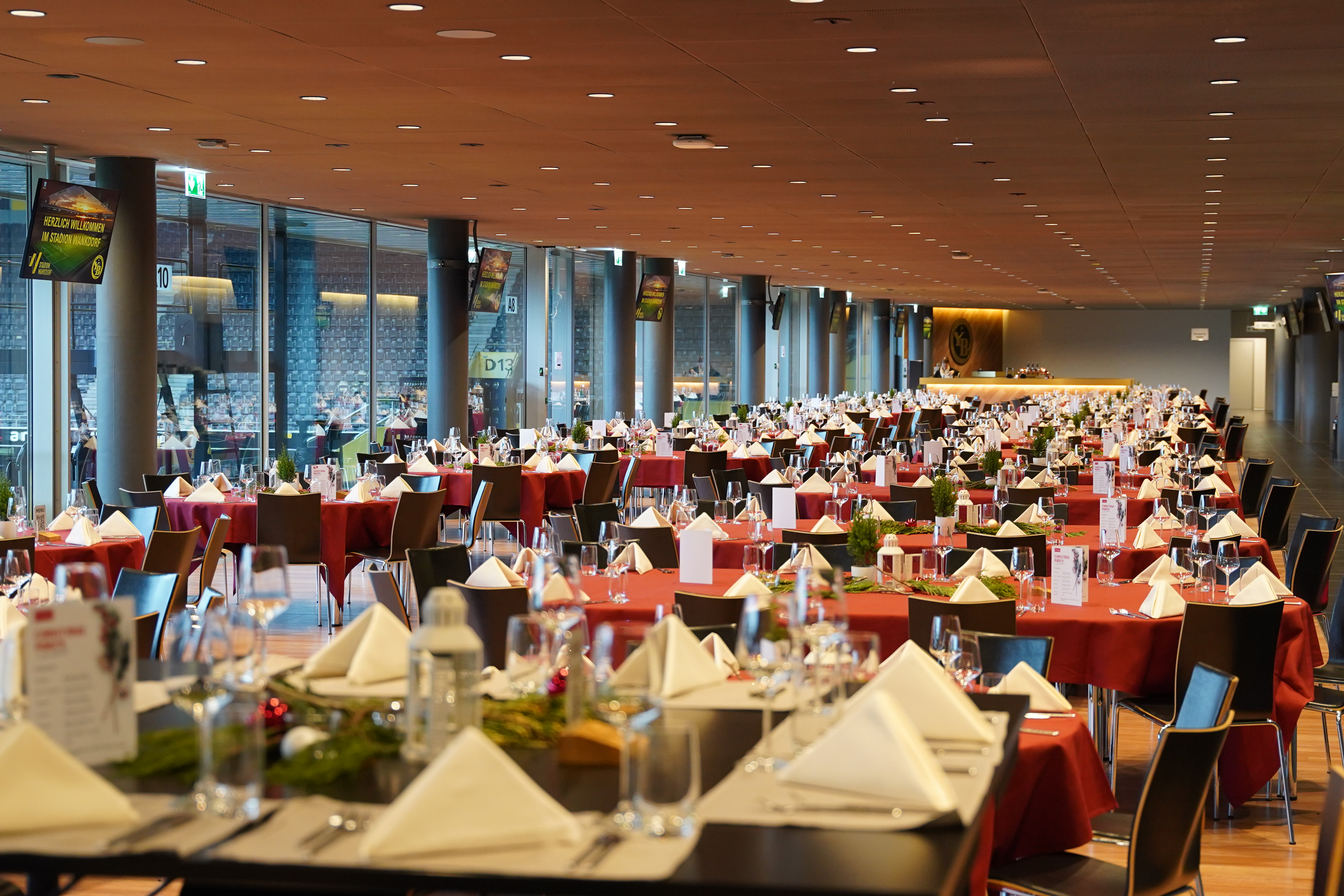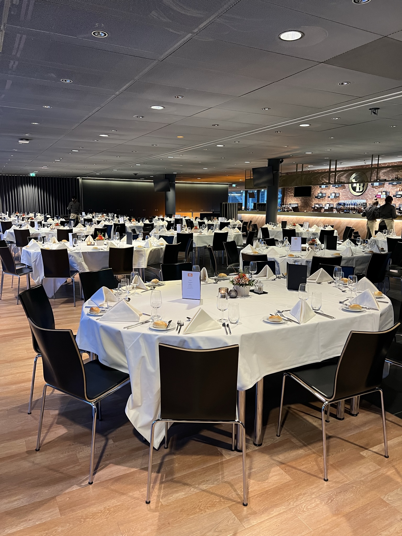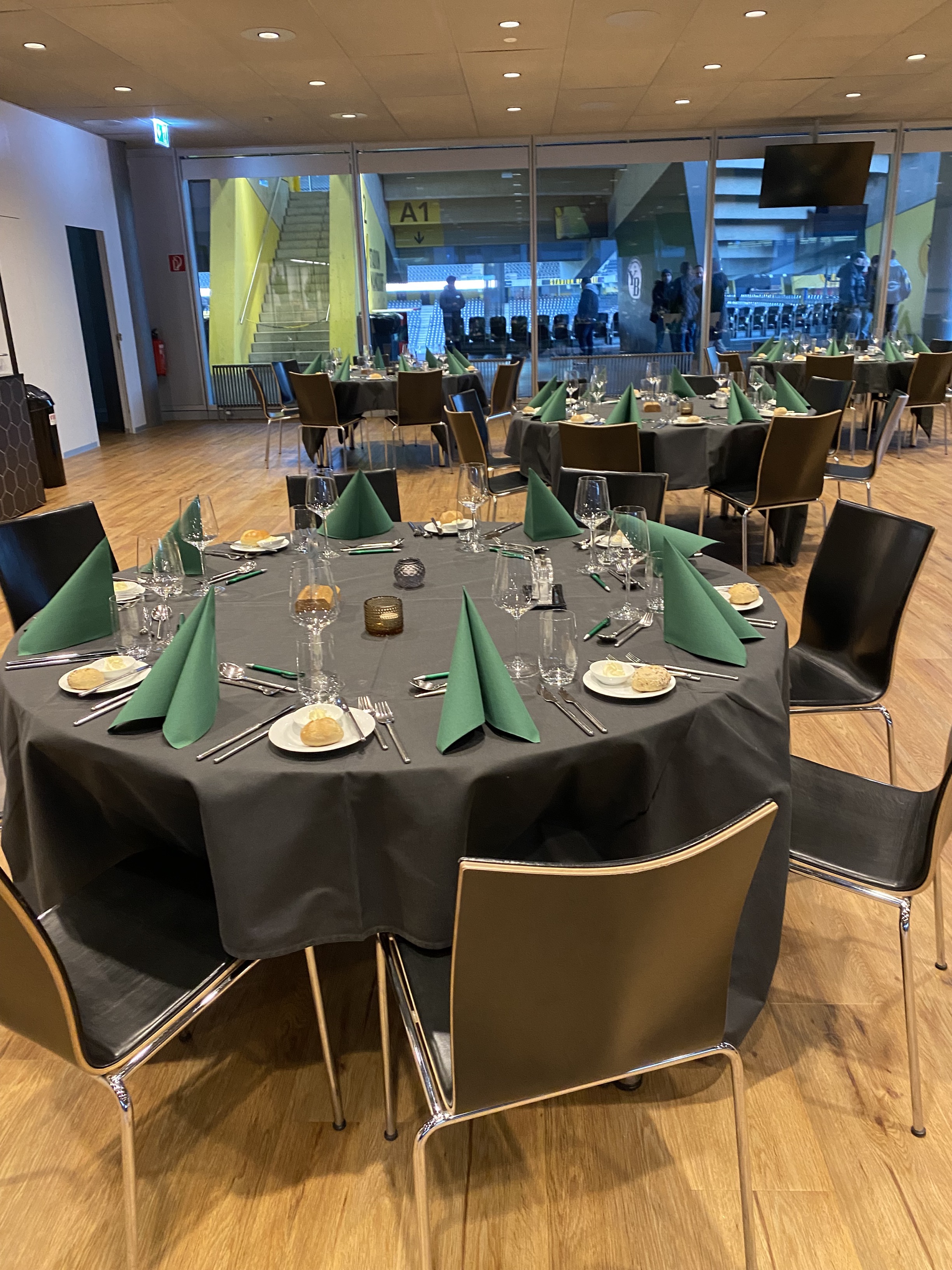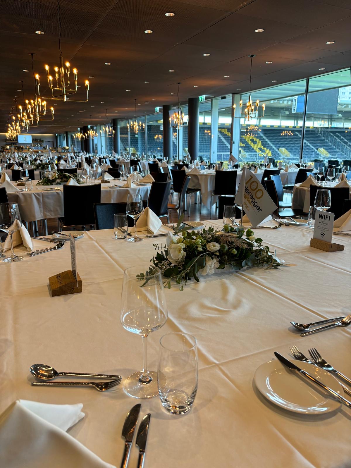 Die Tischdekoration ist ein entscheidendes Element bei der Gestaltung eines Events. Ob rote Tischtücher für festliche Anlässe, schwarze für moderne Eleganz, klassische weisse Tischtücher für zeitlose Schönheit oder lockere Tischsets mit Servietten in der Firmenfarbe als Akzent – für jeden Event gibt es die perfekte Kombination. Auch die Tischform, ob rund, oval, eckig, tief oder hoch, beeinflusst die Atmosphäre im Raum. Mit der richtigen Wahl wird jeder Event zu einem unvergesslichen Erlebnis. All dies bieten wir Ihnen gerne bei uns im Stadion Wankdorf – gerne beraten wir Sie persönlich.