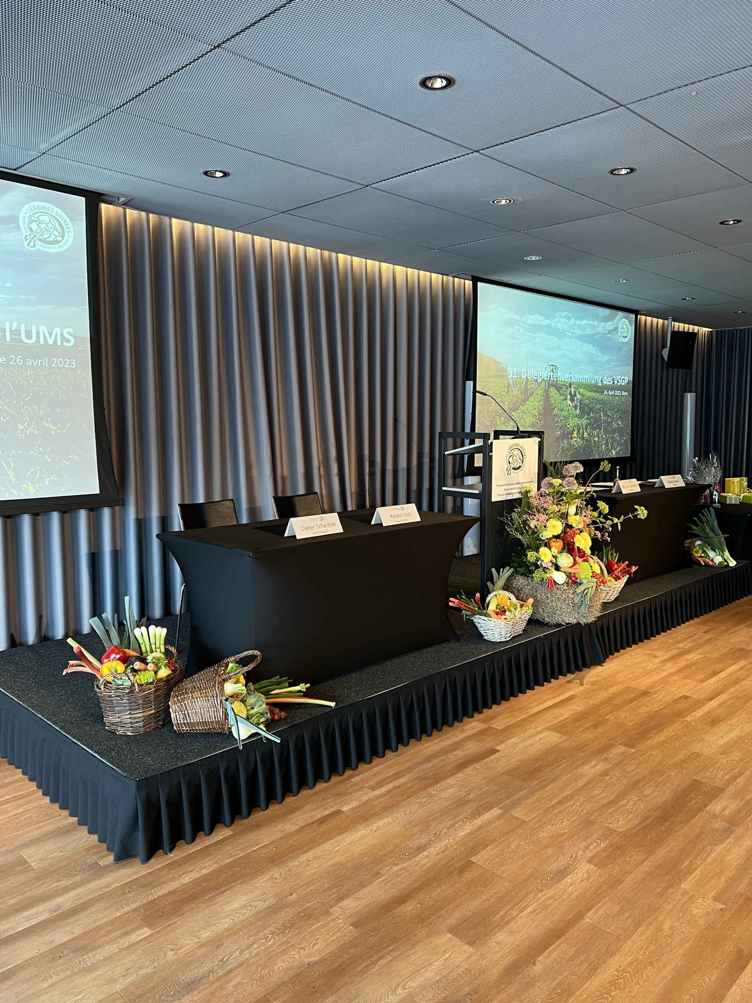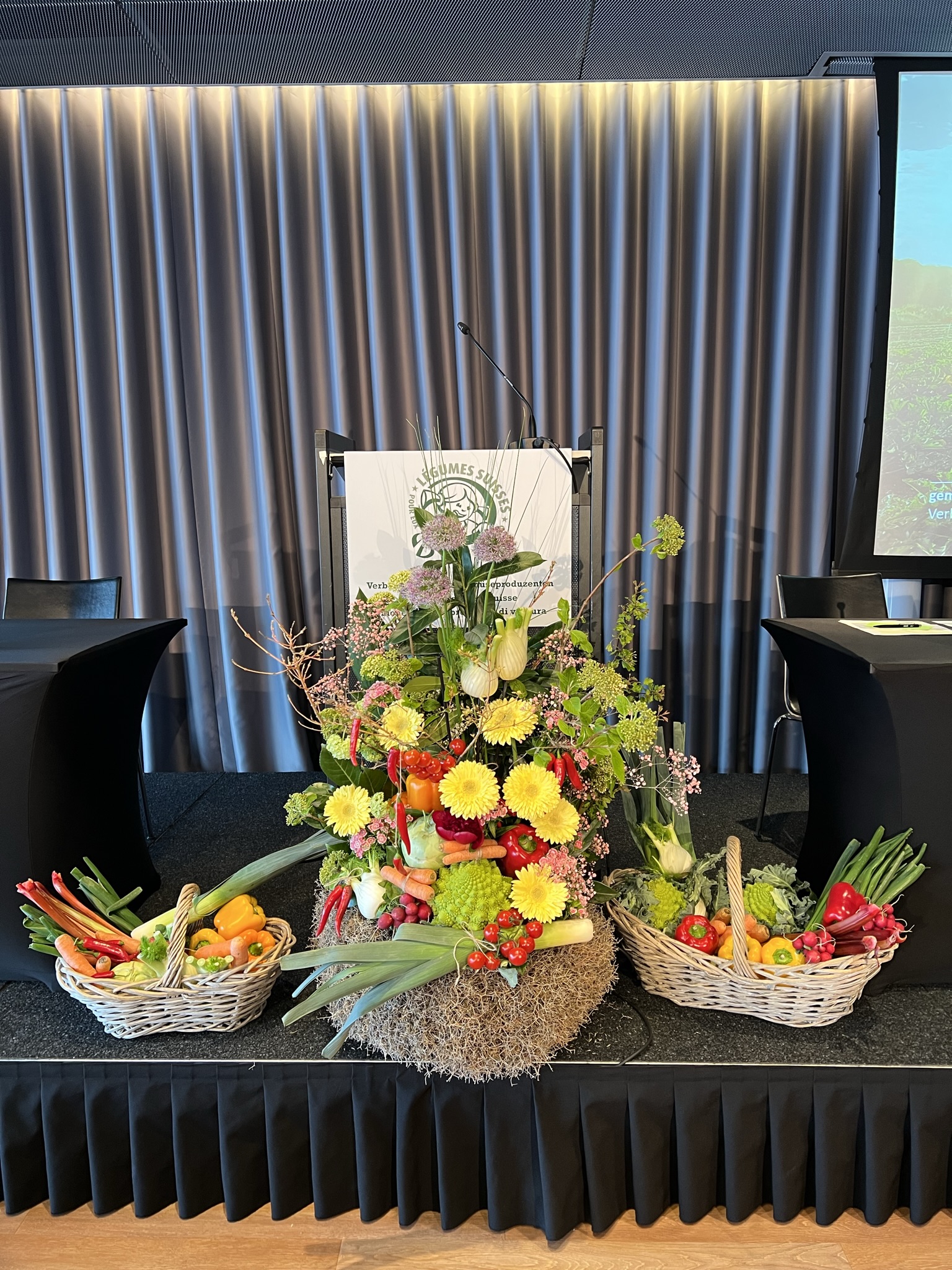 Ende April fand die Delegiertenversammlung des Verbands Schweizer Gemüseproduzenten bei uns in der Champions Lounge statt. Wir durften über 200 Personen auf der Konferenz begrüssen, die am Abend mit einem Apéro endete. Ein spezieller Hingucker war die schöne Dekoration. Die Blumenarrangements wurden mit diversem Schweizer Gemüse gespickt, das die Teilnehmenden und unsere Mitarbeitenden am Ende des Anlasses mit nach Hause nehmen durften.