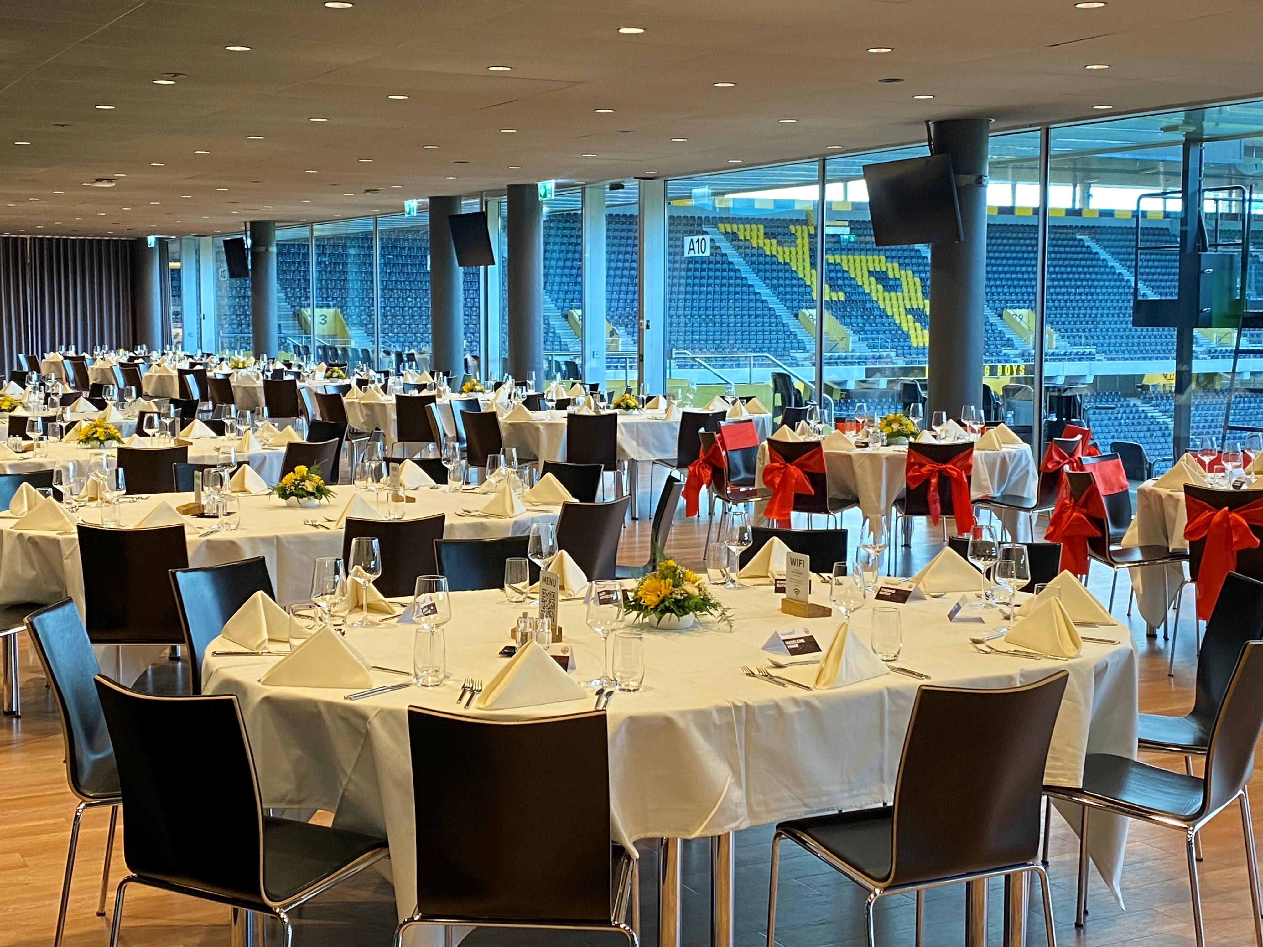 Bei einem Brautpaar, das kein Spiel des BSC Young Boys verpasst, war schnell klar, dass die Hochzeitsfeier im Stadion Wankdorf stattfinden soll. Ende Juni durften wir daher rund 70 Hochzeitgäste bei uns in der Sky Lounge begrüssen. Bei ausgezeichnetem Essen und einer Hochzeitstorte nach Wunsch des Brautpaars verbrachte die ganze Gesellschaft einen unvergesslichen Tag bei uns im Stadion.