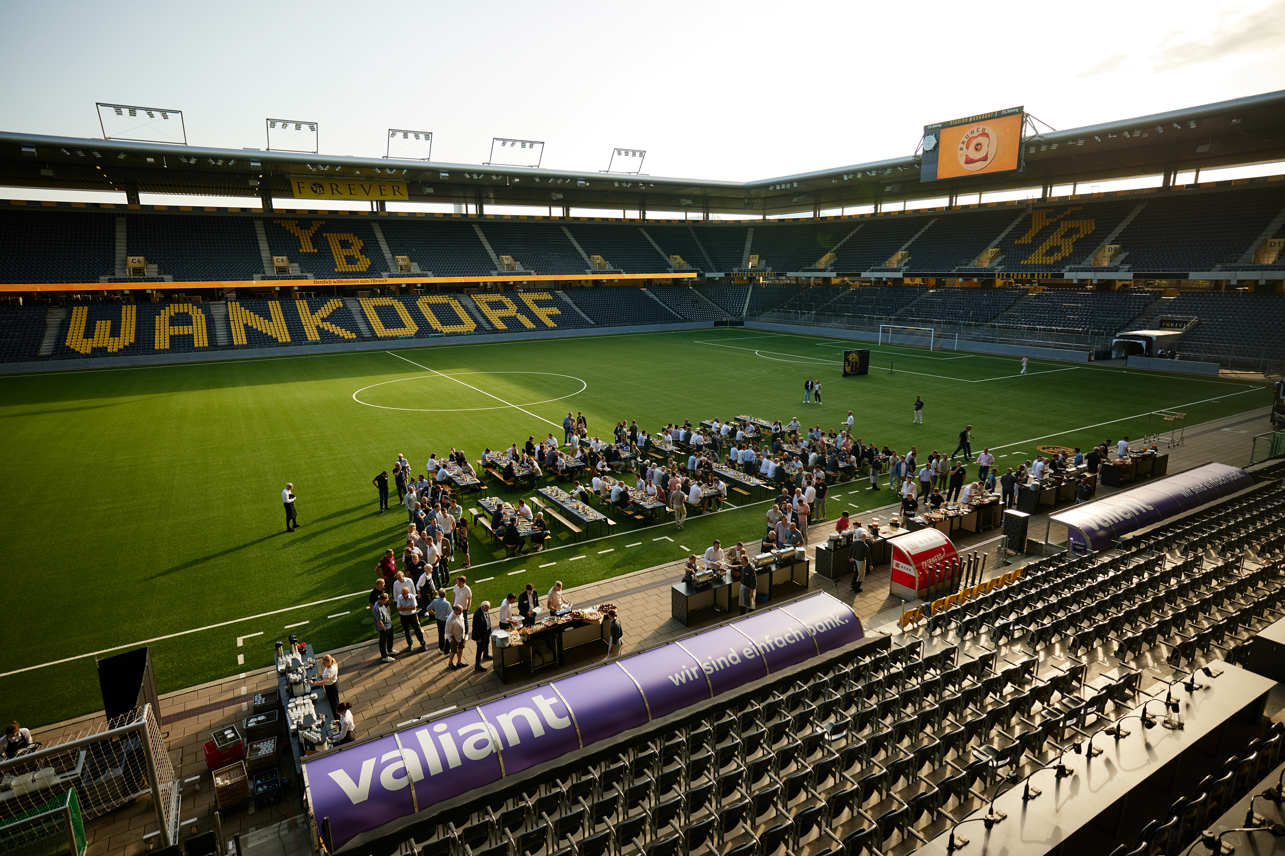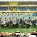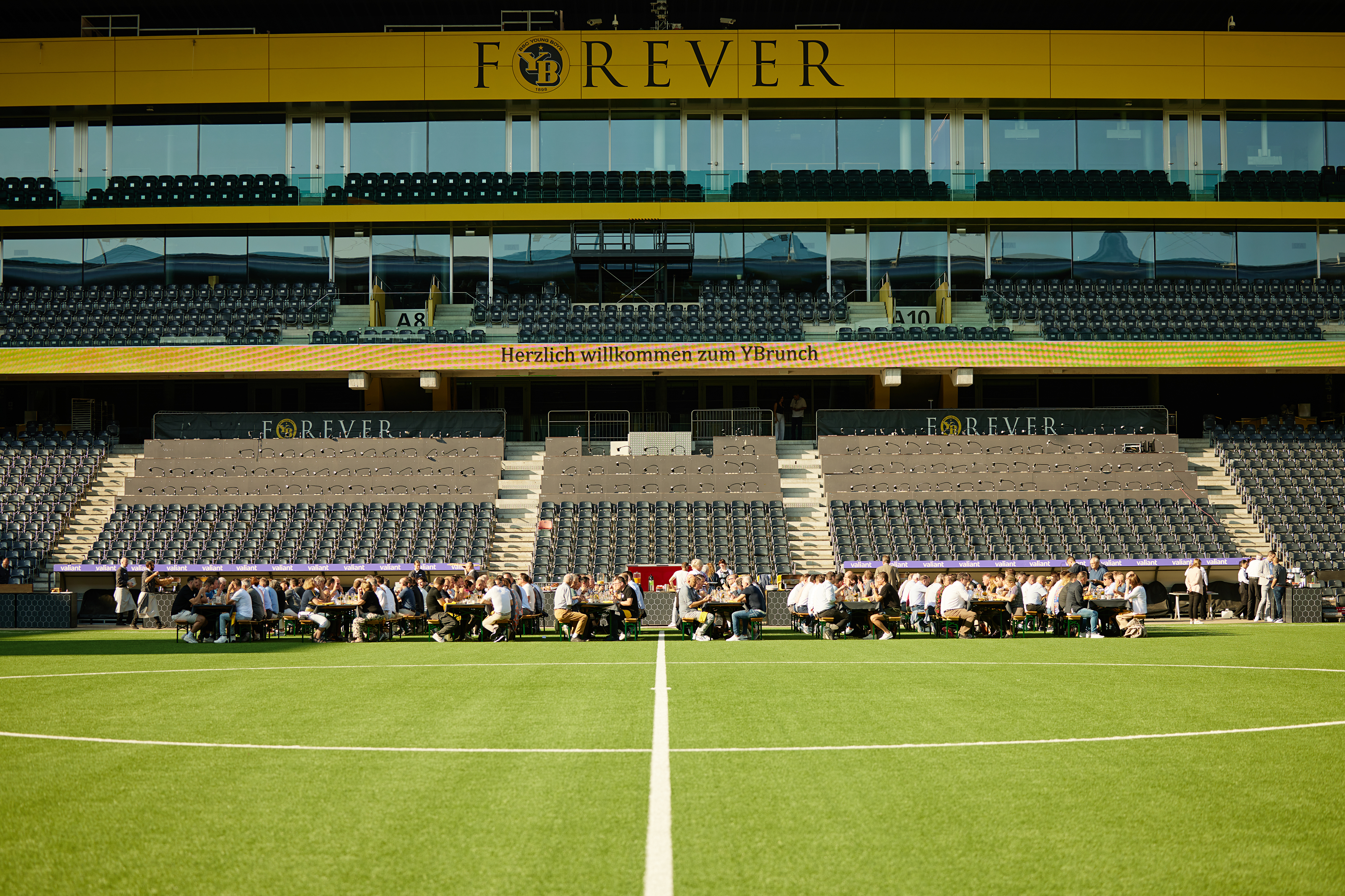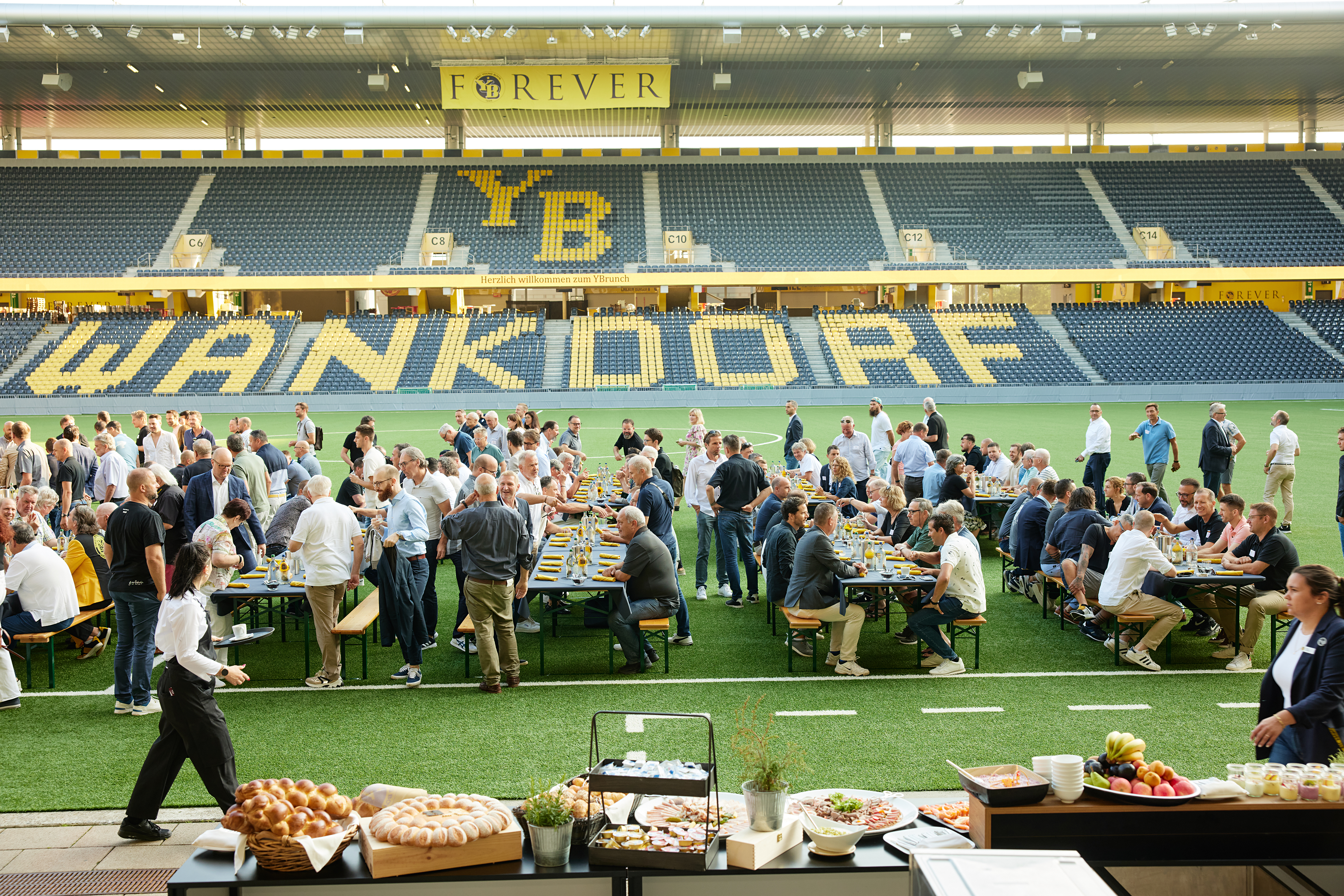 Zum ersten Mal seit 2019 konnte der traditionelle «YBrunch» wieder auf dem Spielfeld durchgeführt werden. Rund 230 Partner:innen sowie Kund:innen der Abteilung Events & Kongresse folgten der Einladung des BSC YB ins Stadion Wankdorf – durch den Spielertunnel direkt auf den Rasen vor die Spielerbänke. An diesem besonderen Ort starteten die Teilnehmenden den Tag mit einem ausgiebigen «Zmorge» sowie gemütlichem Networking.