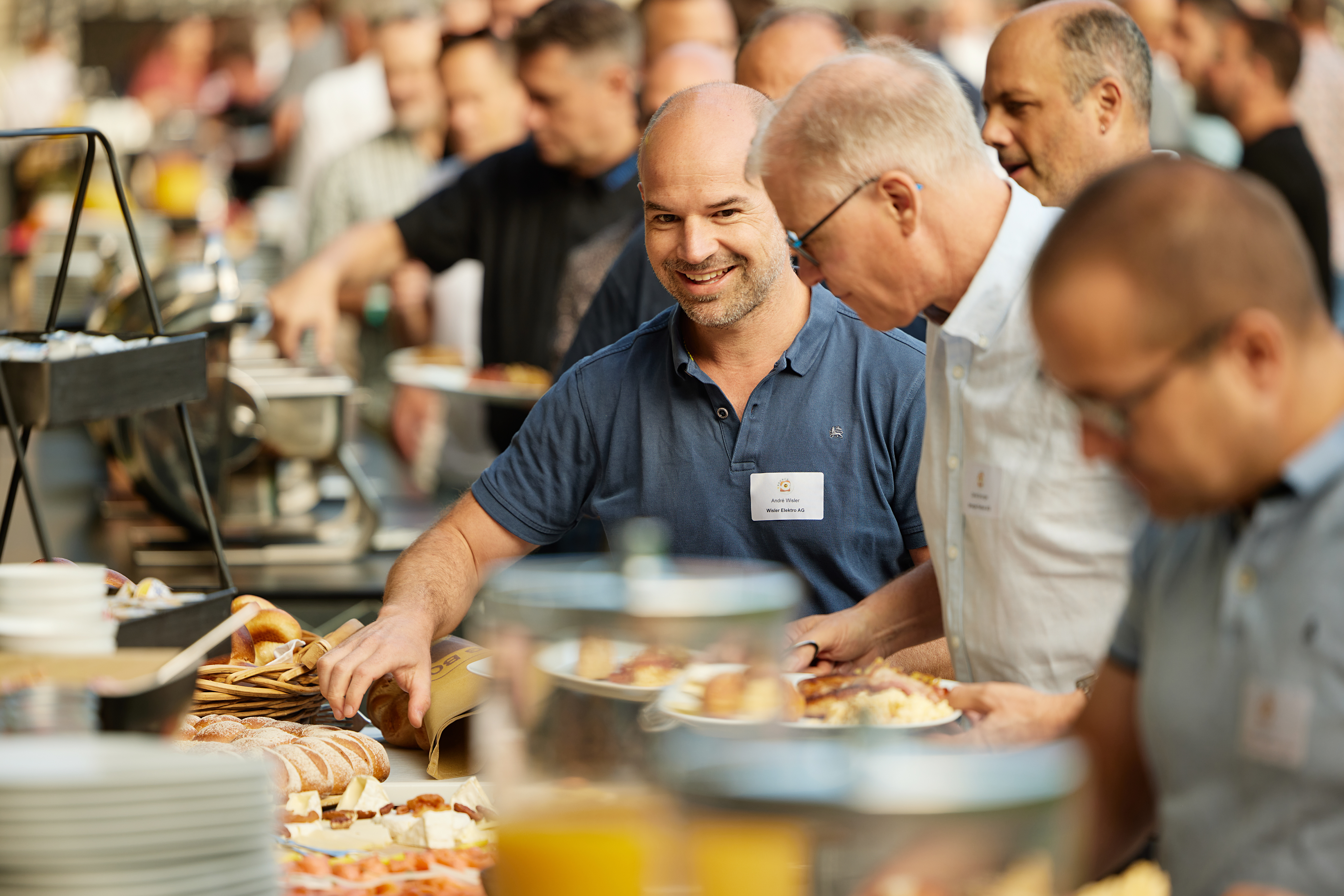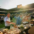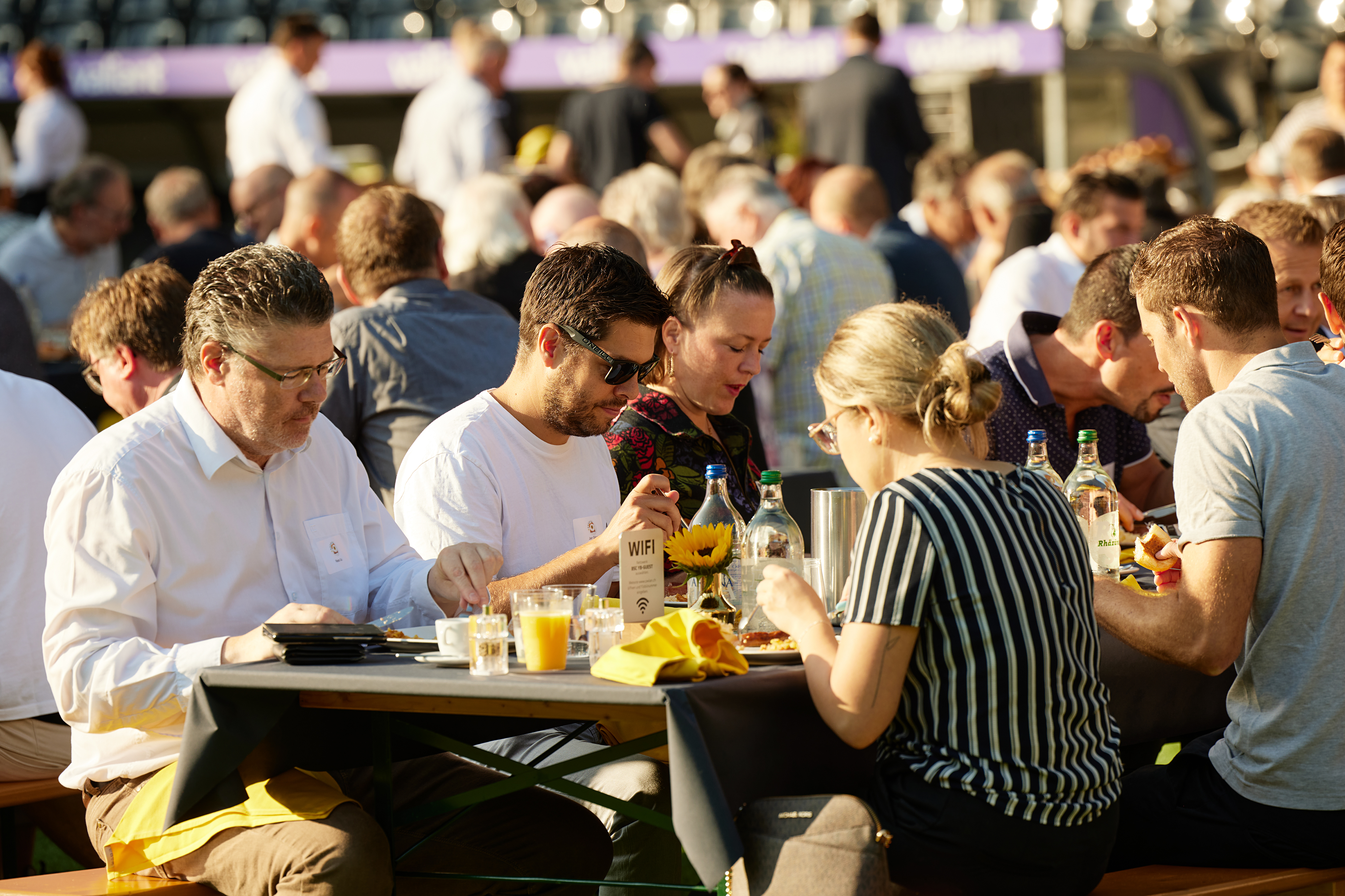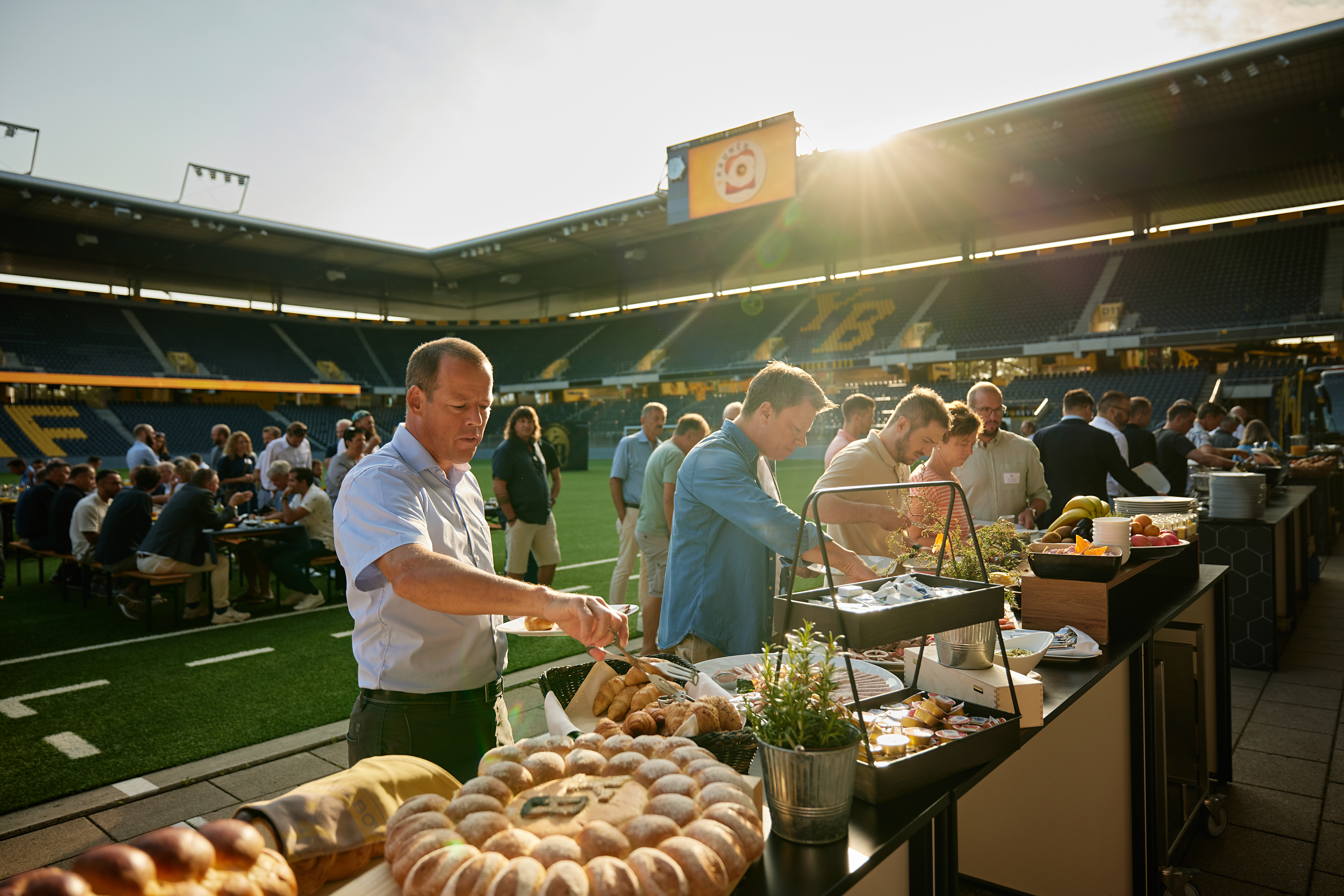 Zum ersten Mal seit 2019 konnte der traditionelle «YBrunch» wieder auf dem Spielfeld durchgeführt werden. Rund 230 Partner:innen sowie Kund:innen der Abteilung Events & Kongresse folgten der Einladung des BSC YB ins Stadion Wankdorf – durch den Spielertunnel direkt auf den Rasen vor die Spielerbänke. An diesem besonderen Ort starteten die Teilnehmenden den Tag mit einem ausgiebigen «Zmorge» sowie gemütlichem Networking.