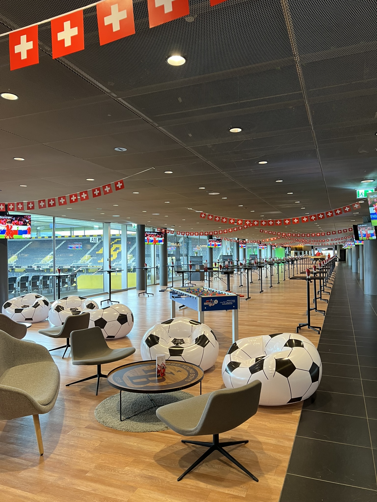 Die Lounges im Stadion Wankdorf bieten eine Vielzahl von Möglichkeiten, die Ihre Veranstaltungen unvergesslich machen. Neben der Nutzung als stilvolle Eventlocation können Sie verschiedene unterhaltsame Aktivitäten buchen, um Ihren Gästen einen abwechslungsreichen Aufenthalt zu bieten – darunter Töggelikasten, Torwandschiessen, Tischtennis und vieles mehr. Das Stadion Wankdorf ist somit nicht nur geeignet für Meetings, sondern auch ein Ort voller Möglichkeiten für kreative und unterhaltsame Aktivitäten. Machen Sie Ihre nächste Veranstaltung zu einem besonderen Erlebnis!
