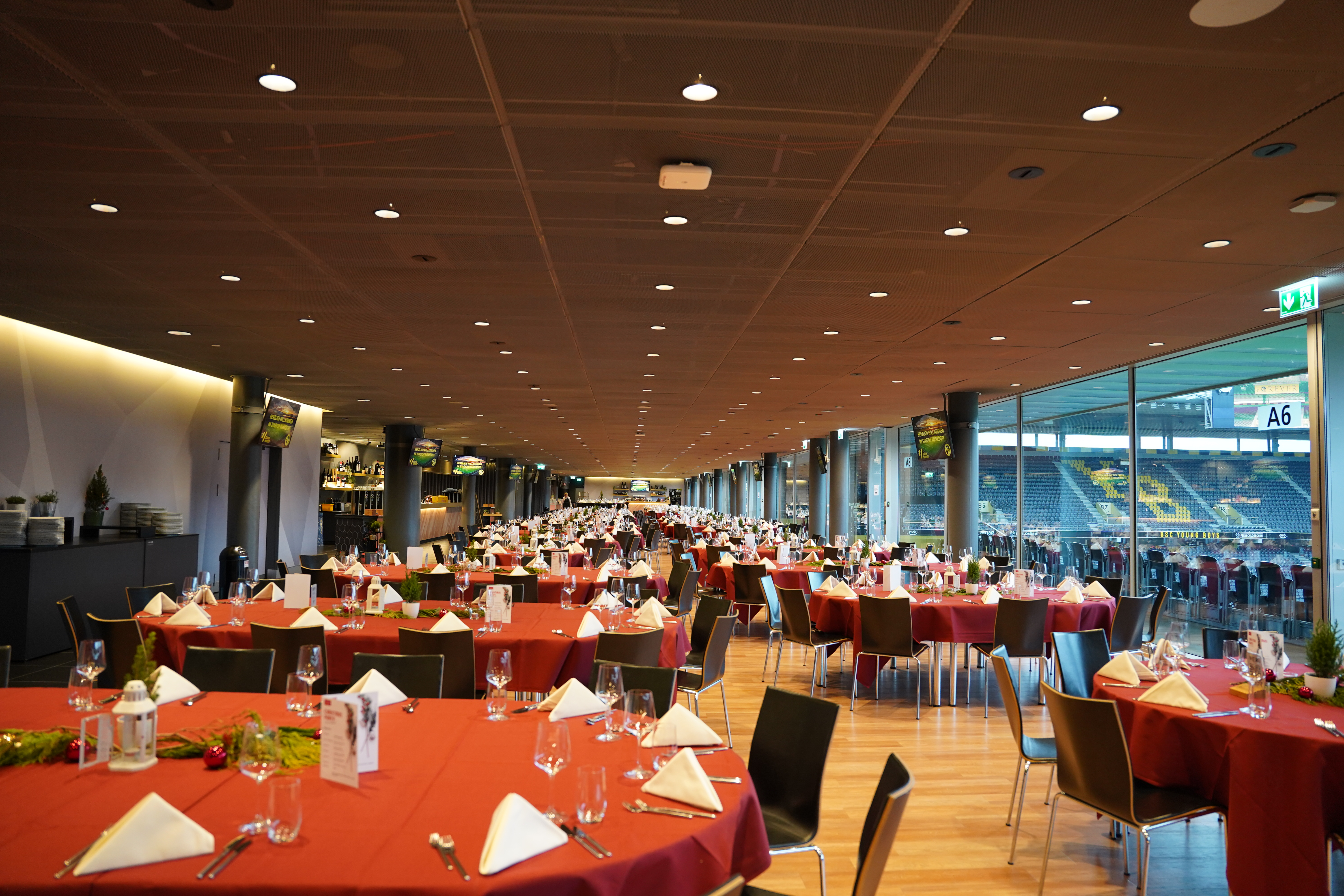 Weihnachten steht vor der Tür und somit auch viele tolle Weihnachtsfeiern bei uns im Stadion Wankdorf. Dort, wo normalerweise spannende Spiele stattfinden, verwandelt sich die Umgebung zu einer Oase der Besinnlichkeit. Am Freitag, 13. Dezember 2024 erstrahlte der Stadionumgang in festlichem Glanz, ein Tannenwäldchen mit funkelnden Lichtern erfüllte die kalte Winterluft mit einer warmen, einladenden Stimmung und versetzte die Gäste in Weihnachtsstimmung. In der Champions Lounge zierten rote Tischtücher die Tische und der Raum erstrahlt in festlichem Glanz. Hier lässt sich bei leckerem Essen und einer Tasse Glühwein ganz entspannt feiern. Die festliche Atmosphäre und die anschliessende Party in der Valiant Lounge machte den Abend zu einem unvergesslichen Erlebnis.